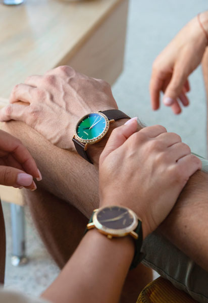 Vytvorili sme luxusné elegantné hodinky, ktoré si môžete skombinovať presne podľa svojho vkusu až do posledného detailu. Okrem výberu odtieňa zlatých pánskych ai dámskych hodiniek je na vás i voľba ručne vkladaných drahokamov, ktoré lemujú zafírové sklíčko ciferníka, ktorého farbu si tiež určíte sami. Na výber máte lab-grown alebo prírodné diamanty v bielom, čiernom, modrom, champagne, zelenom, koňakovom a žltom odtieni, alebo modré, ružové a červené zafíry. Fantázii sa medze nekladú, preto sa nebojte vytvoriť originálne čierno-zlaté hodinky alebo dizajnový model s kombináciou niekoľkých farebných drahokamov. Čo tak mať hodinky s osobným detailom? Na všetky pánske i dámske hodinky vám na želanie vygravírujeme váš obľúbený symbol, iniciály alebo citát. Už viete, ako budú vyzerať vaše zlaté hodinky.