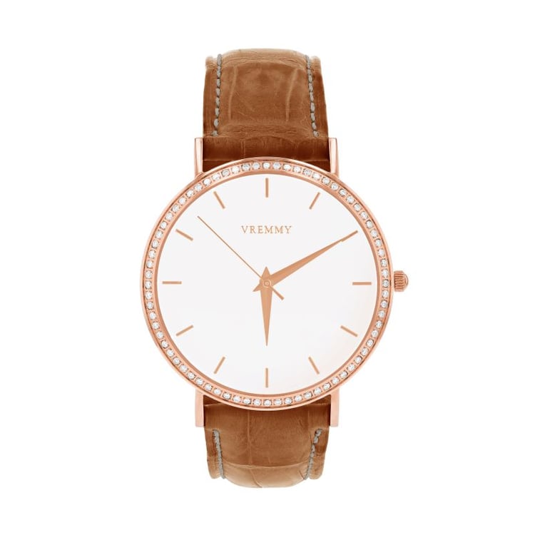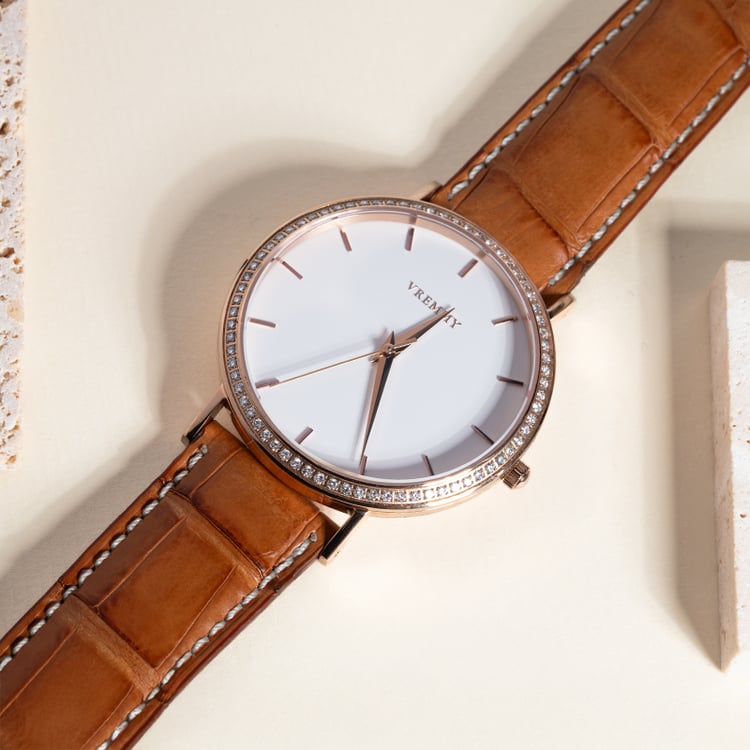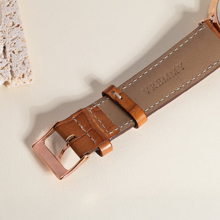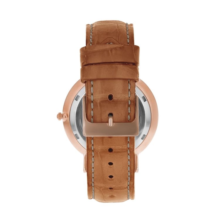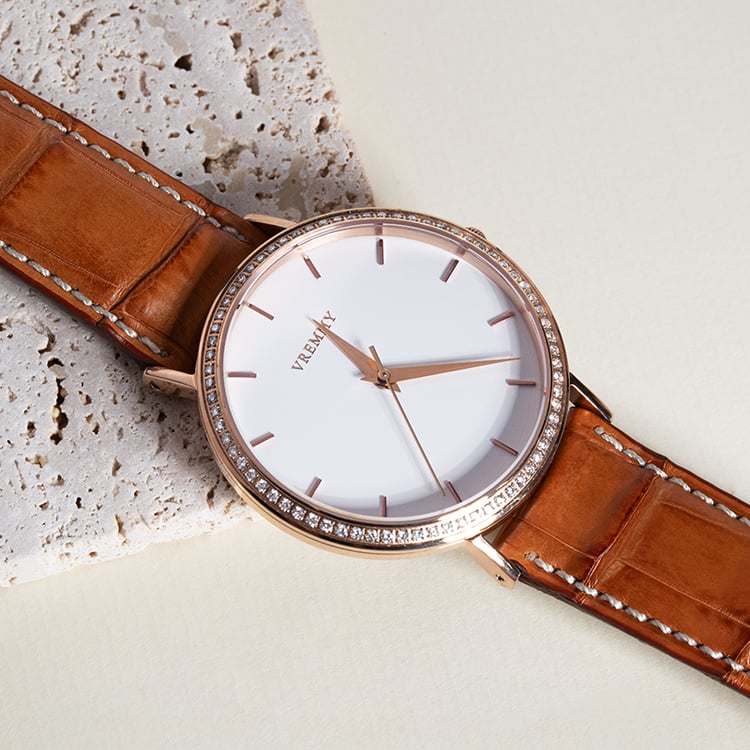 - oceľové puzdro v ružovej farbe a koňakový remienok z krokodílej kože