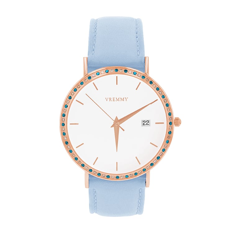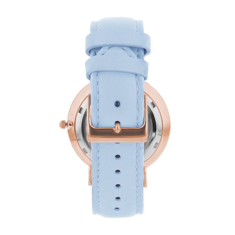 - oceľové puzdro v ružovej farbe a svetlomodrý remienok z nappa kože