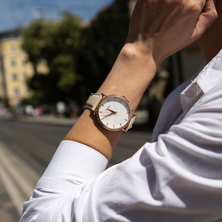 - ručne osadené modré a champagne diamanty vyniknú v spojení s bielym ciferníkom