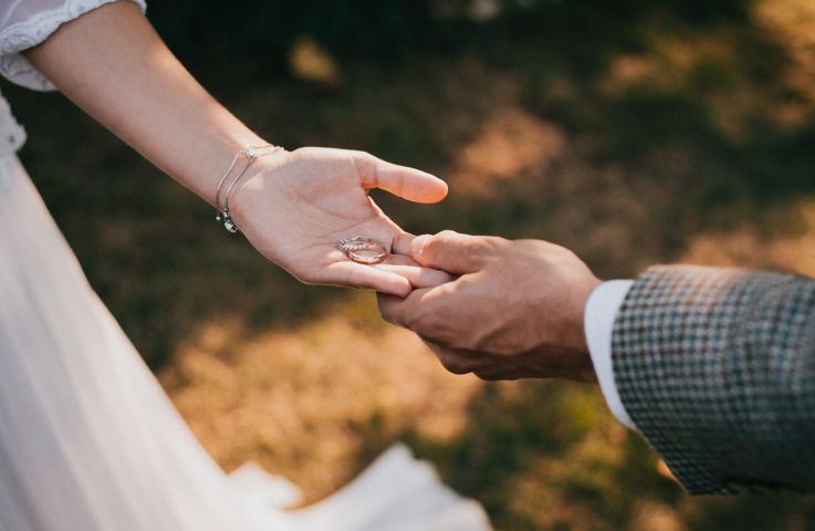 Potom si snúbenci vzájomne nastoknú svadobné obrúčky na ľavý prstenník a celý rituál sa končí novomanželským bozkom. Tradíciou je si spolu s matrikárkou a oddávajúcim/ou pripiť. Nasledujú gratulácie – najskôr hostia blahoželajú neveste a potom ženíchovi. Novomanželia odchádzajú utvoreným špalierom, kam svadobčania hádžu okvetné lístky, konfety, alebo fúkajú dúhové bubliny.