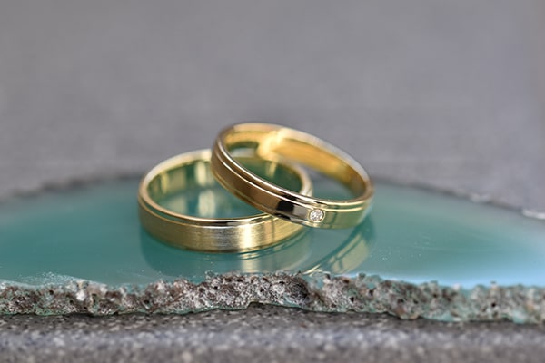 Svadobné obrúčky s diamantom symbolizujú pevný základ manželstva. Očakáva sa od nich, že vydržia naveky, dbajte preto aj na kvalitu drahých kameňov. Tú vám zaručia tradičné hodnotiace parametre (farba, brus, čistota a karátová hmotnosť), rovnako ako certifikát z renomovaného laboratória. Spravidla malé diamanty osadzujú klenotníci v pavé štýle, ktorý vhodne doladí zásnubný prstienok.