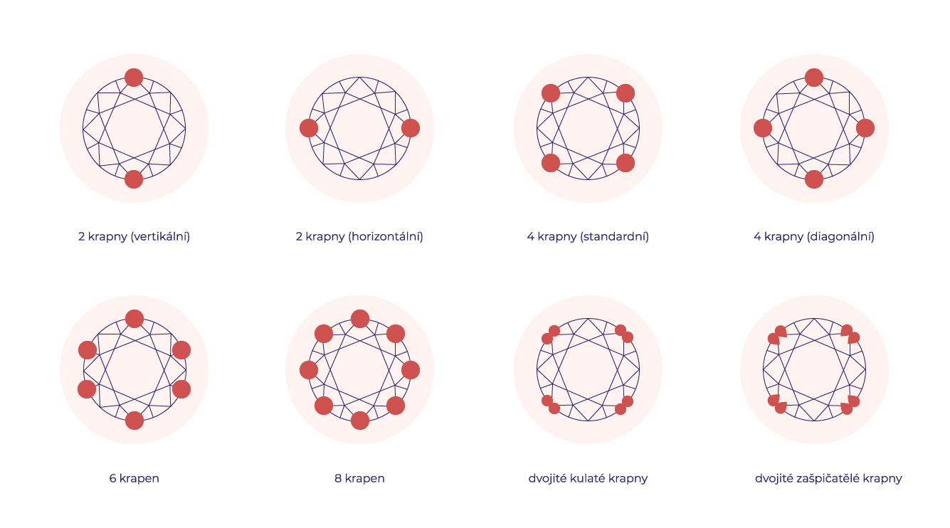 Počet krapničiek určuje výsledný vzhľad šperku. Klasický Tiffanyho štýl so šiestimi krapňičkami vytvára dokonale okrúhly dizajn a vyhráva tak pri zásnubných prsteňoch a pri ukotvení briliantov. Na štyri krapničky sa klenotníci zameriavajú pri osadzovaní menších drahokamov, ktoré by sa pri väčšom množstve kovu mohli opticky utopiť a prísť o svoj lesk. Pri náušniciach sa najčastejšie stretávame s tromi krapničkami. V posledných rokoch rastie popularita dvojitých krapničiek (double) a ich zdvojenému počtu (osem alebo dvanásť krapní).